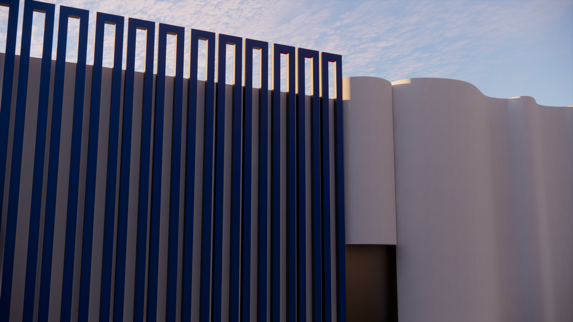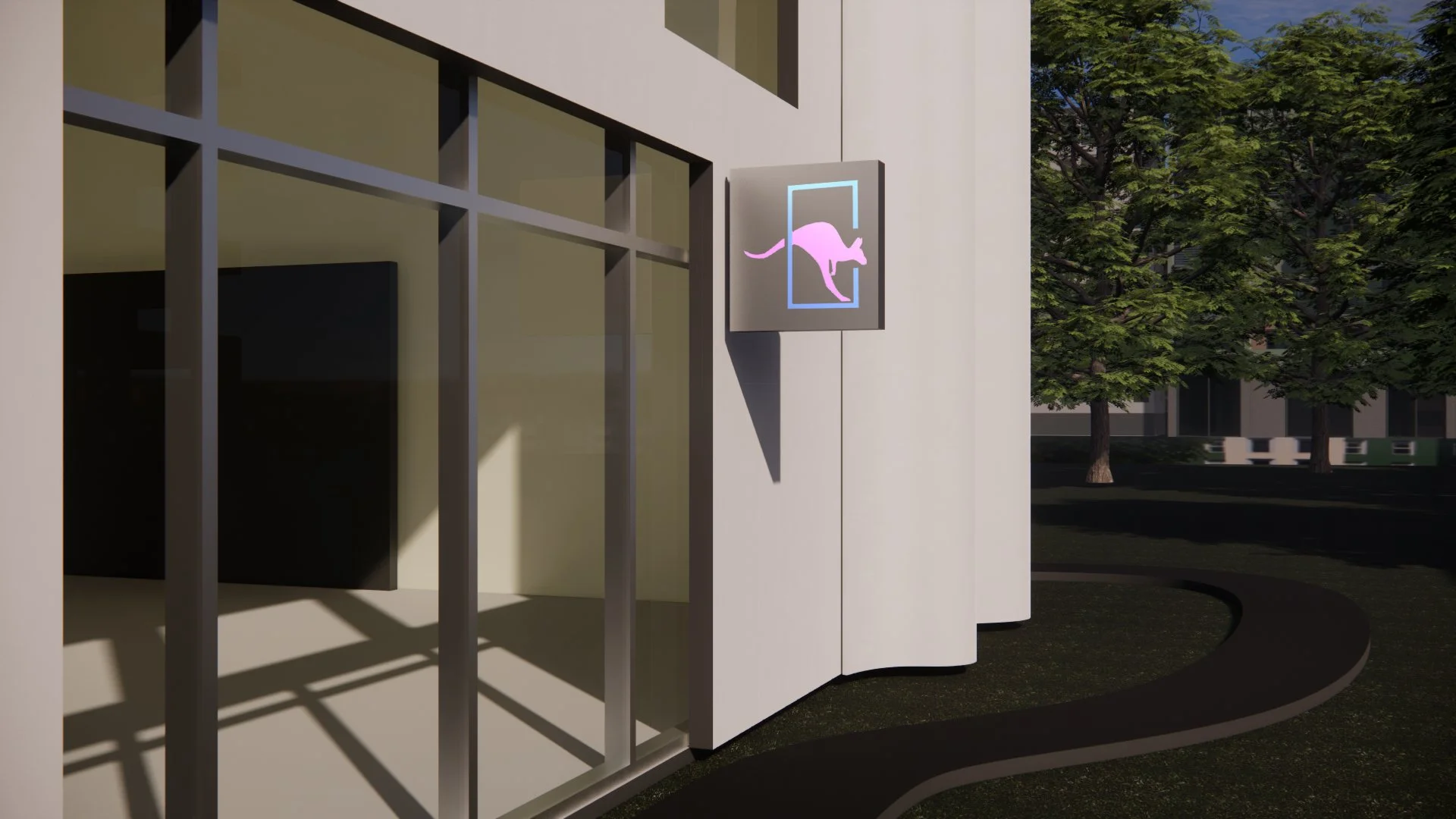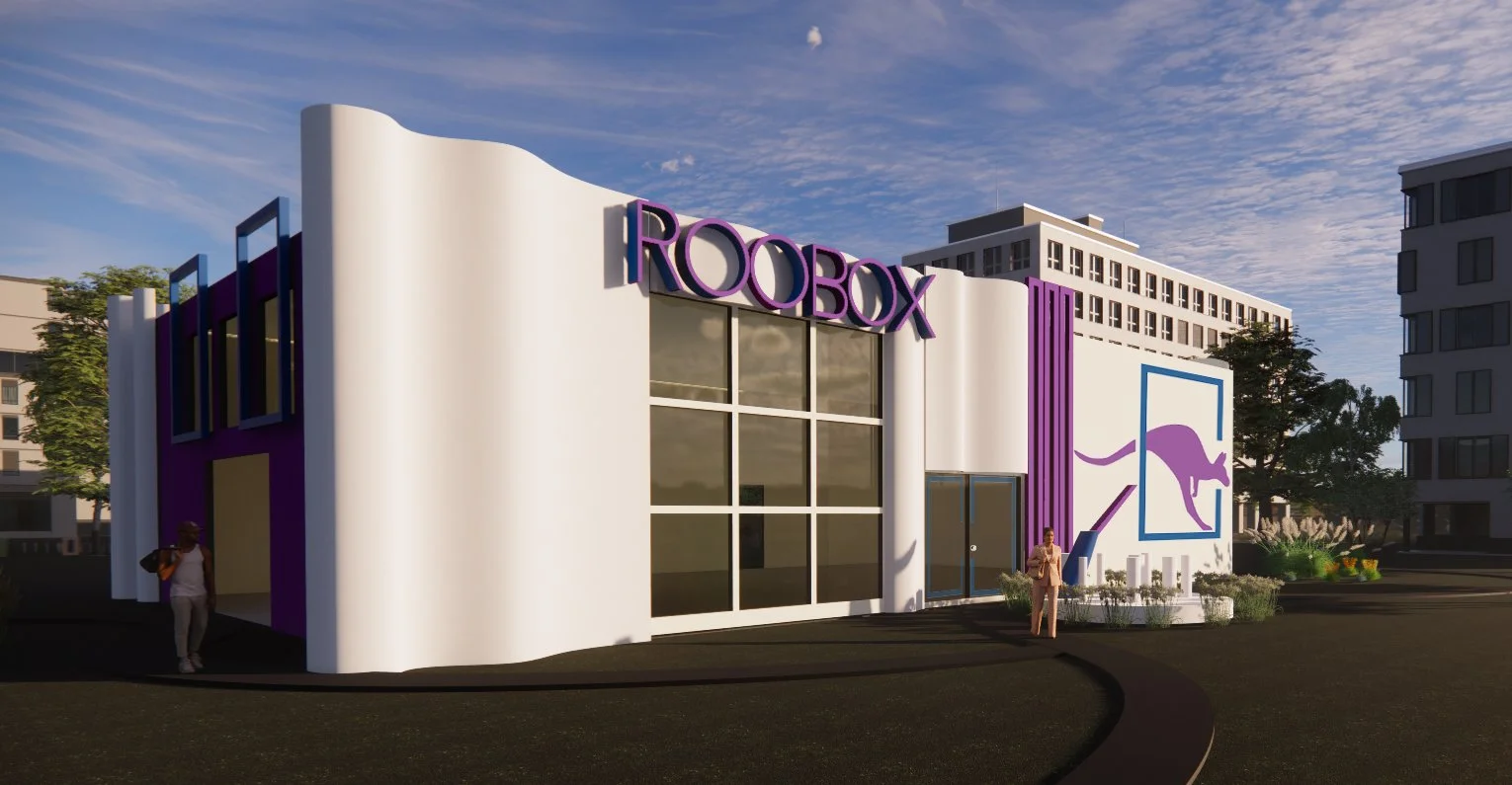 The Roobox building design is mountain inspired with soft, curved lines. The main facade prominently displays the logo and name, while smaller signage is at the side entrance. This cohesive design showcases the brand and enhances the building's aesthetic.